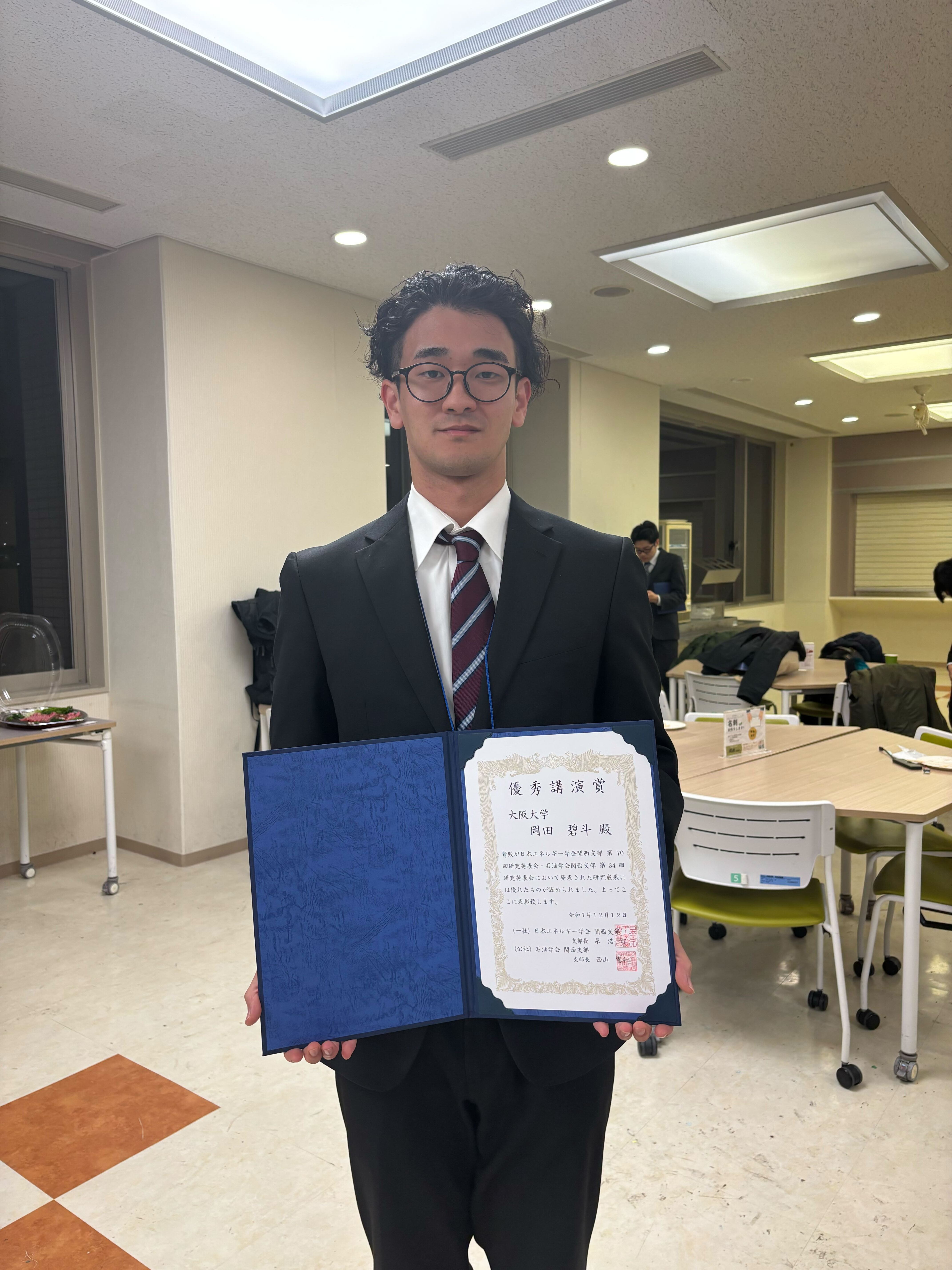 大阪工業大学 大宮キャンパスにて開催された日本エネルギー学会関西支部 第 70 回研究発表会にて、M2の岡田がポスター発表、M1の田中が口頭発表を行いました。また、岡田が優秀講演賞を受賞しました。
