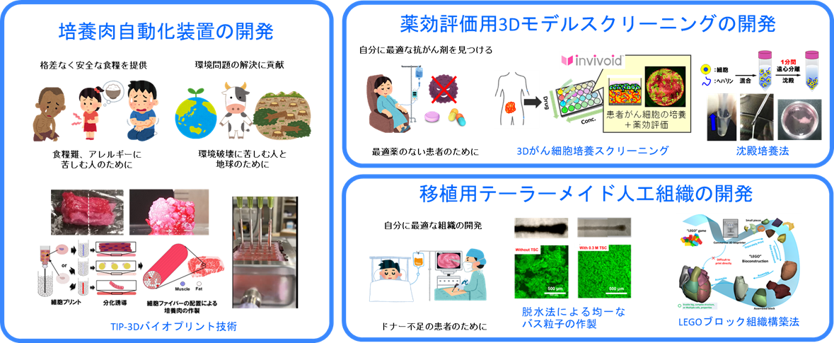 本研究課題では、3Dバイオプリント技術および分光分析技術を複合的に組み合わせることで生体組織の物理化学的特徴および生物学的機能を高度に再現した3D組織体の構築および分析技術を開発する。具体的には、3Dプリンタを活用した培養肉自動化装置の開発、薬効評価用3Dモデルスクリーニングの開発、移植用テーラーメイド人工組織の開発に取り組む。